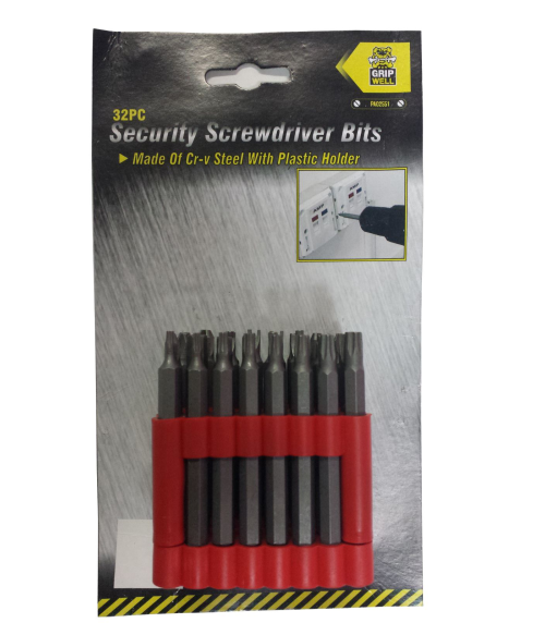 Gripwell Security Screwdriver Bits Set made from high quality CRV Steel. It is perfect for your home or workplace screwdriver needs. Comes with a Plastic Holder. Comes in set of 32. Size: 75 mm.