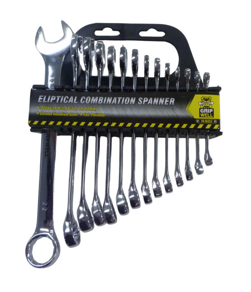 Gripwell 14 Pieces Elliptical Combination Spanner These are faithful professional, high quality combination spanners. They are forged from chrome vanadium steel. It is hardened, tempered and satin chrome plated for corrosion protection. Made up of high quality material. 6-17mm, 19mm, 22mm
