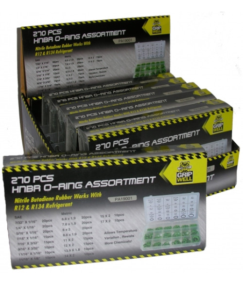 Gripwell HNBR O-Ring Assortment is made of hydrogenated nitrile butadiene, suitable for applications that require higher resistance to chemicals and higher temperatures. Suitable for high dynamic loads and is abrasion resistant. Pack contains 270 various sized o rings. Assortment O-rings with convenient resealable plastic case.