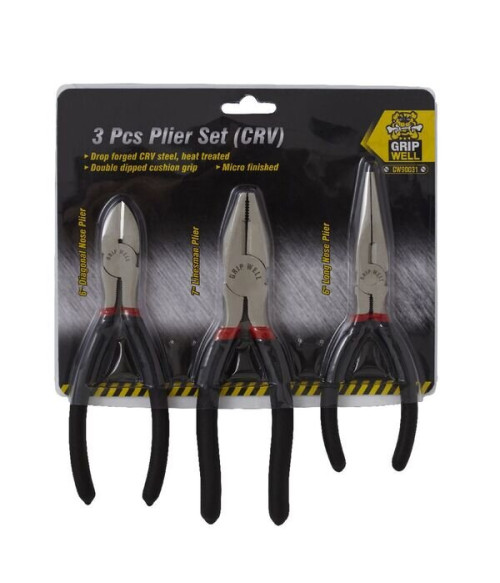 Gripwell Micro Finish 3pc Plier Set is made from high grade materials with padded handles. These pliers feature an ergonomic design to provide high performance and comfort. Comes in a 3 pieces set, Long Nose, Combination and Diagonal Cut.